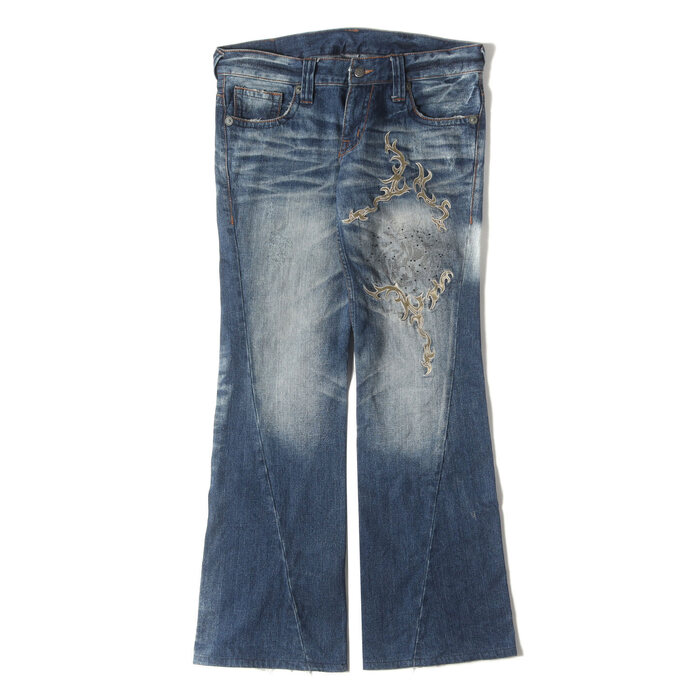00s ラインストーン刺繍デザインブーツカットデニムパンツ